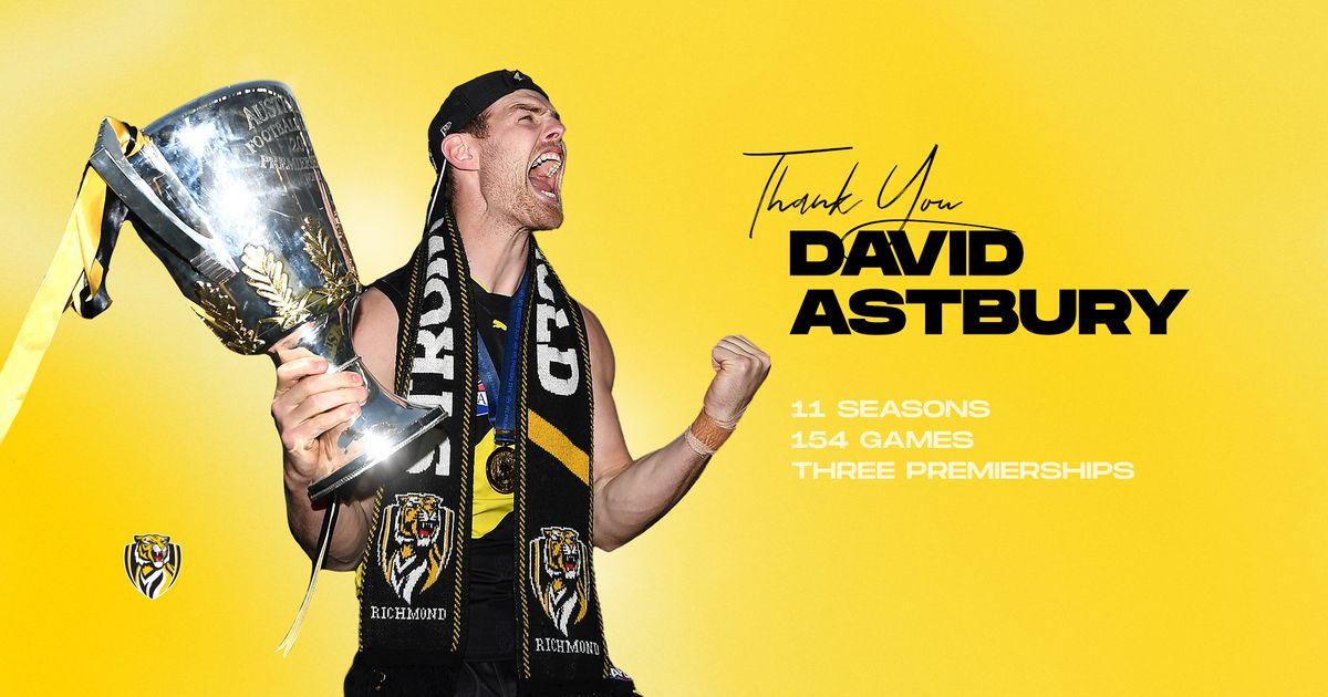 Triple premiership defender David Astbury will hang up the boots after 12 seasons in the AFL with Richmond. NAB AFL Trade Period Rumours. Astbury has cartilage damage behind the knee cap having been hurt in the loss to St Kilda on Saturday when he landed awkwardly after a marking contest.